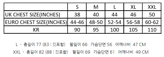 | [40] 가슴 62 / 소매 86 / 총장 77 [42] 가슴 66 / 소매 87 / 총장 81 [44] 가슴 68 / 소매 89 / 총장 84 |