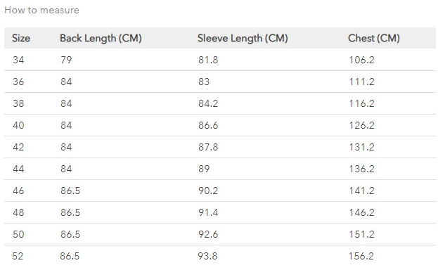 UK42(EU52) 사이즈가 많이 걱정됐는데 딱 맞게 잘 산거 같아요. 키 175에 몸무게 84키로에요. 운동을 오래해서 상체가 발달되서 국내에서는 105입고 셔츠는 110입어요~^^
